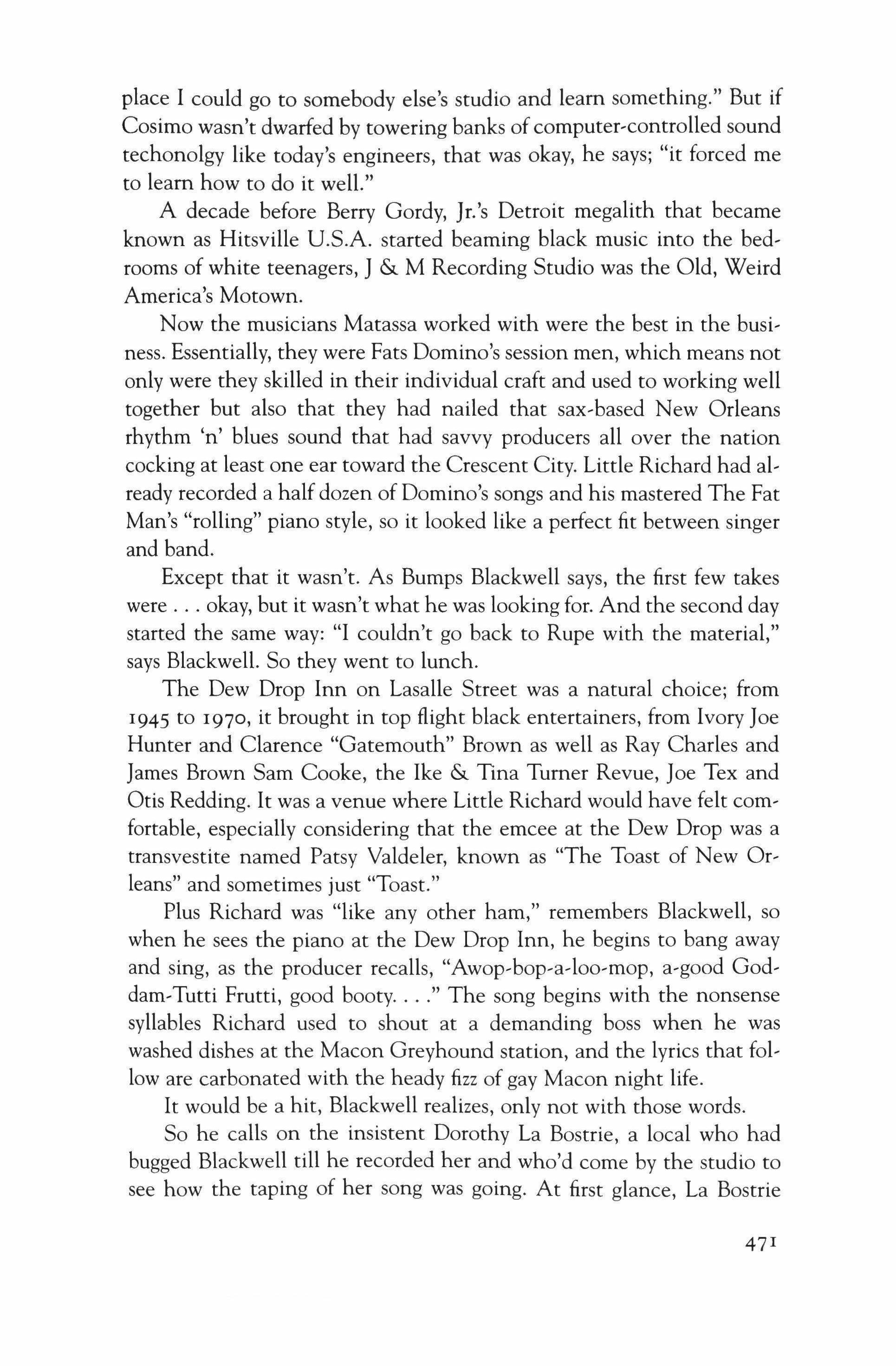 Now the musicians Matassa worked with were the best in the business. Essentially, they were Fats Domino's session men, which means not only were they skilled in their individual craft and used to working well together but also that they had nailed that sax-based New Orleans rhythm 'n' blues sound that had savvy producers all over the nation cocking at least one ear toward the Crescent City. Little Richard had already recorded a half dozen of Domino's songs and his mastered The Fat Man's "rolling" piano style, so it looked like a perfect fit between singer and band.