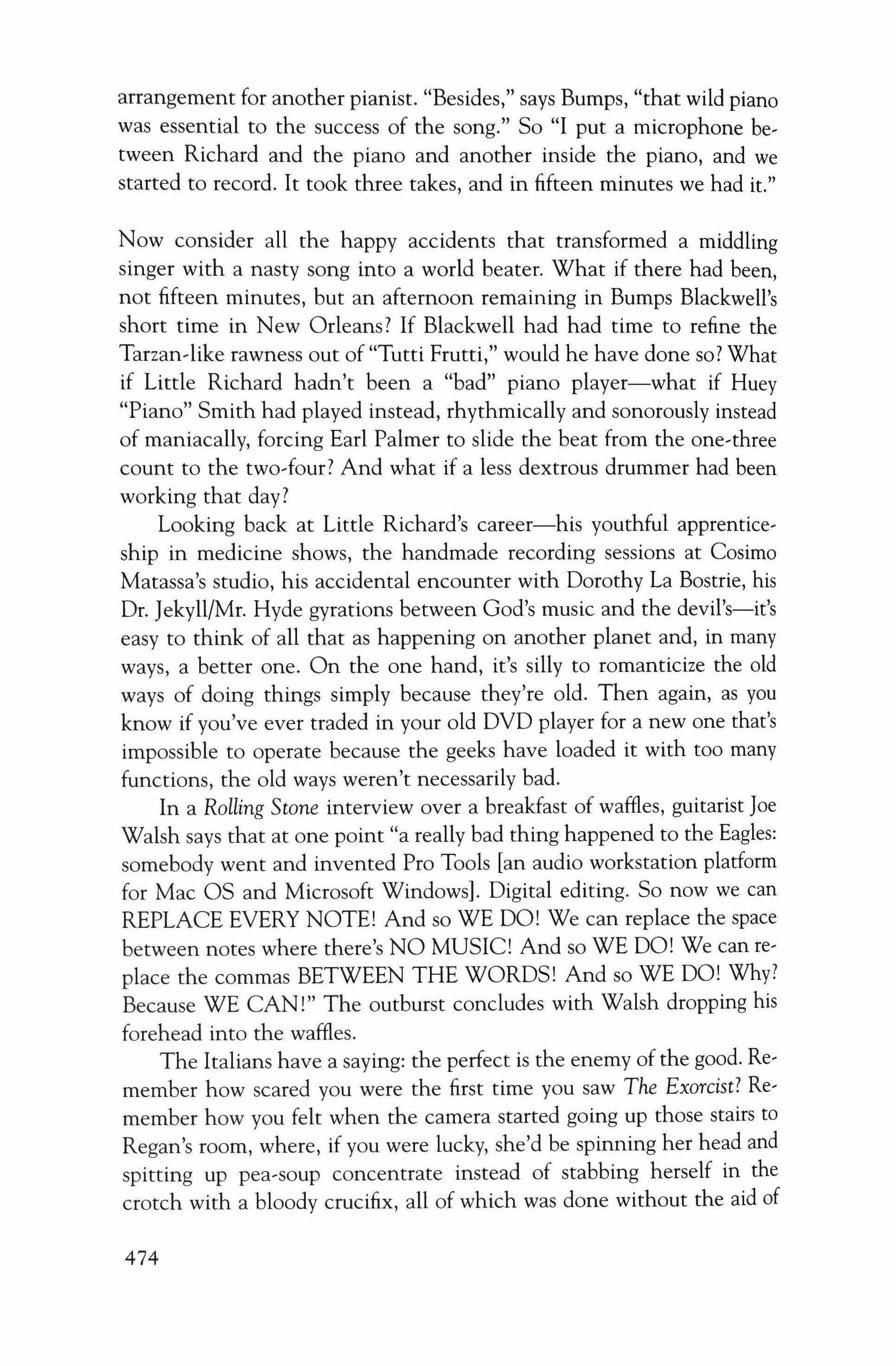 Now consider all the happy accidents that transformed a middling singer with a nasty song into a world beater. What if there had been, not fifteen minutes, but an afternoon remaining in Bumps Blackwell's short time in New Orleans? If Blackwell had had time to refine the Tarzan-like rawness out of "Tutti Frutti," would he have done so? What if Little Richard hadn't been a "bad" piano player-what if Huey "Piano" Smith had played instead, rhythmically and sonorously instead of maniacally, forcing Earl Palmer to slide the beat from the one-three count to the two-four? And what if a less dextrous drummer had been working that day?