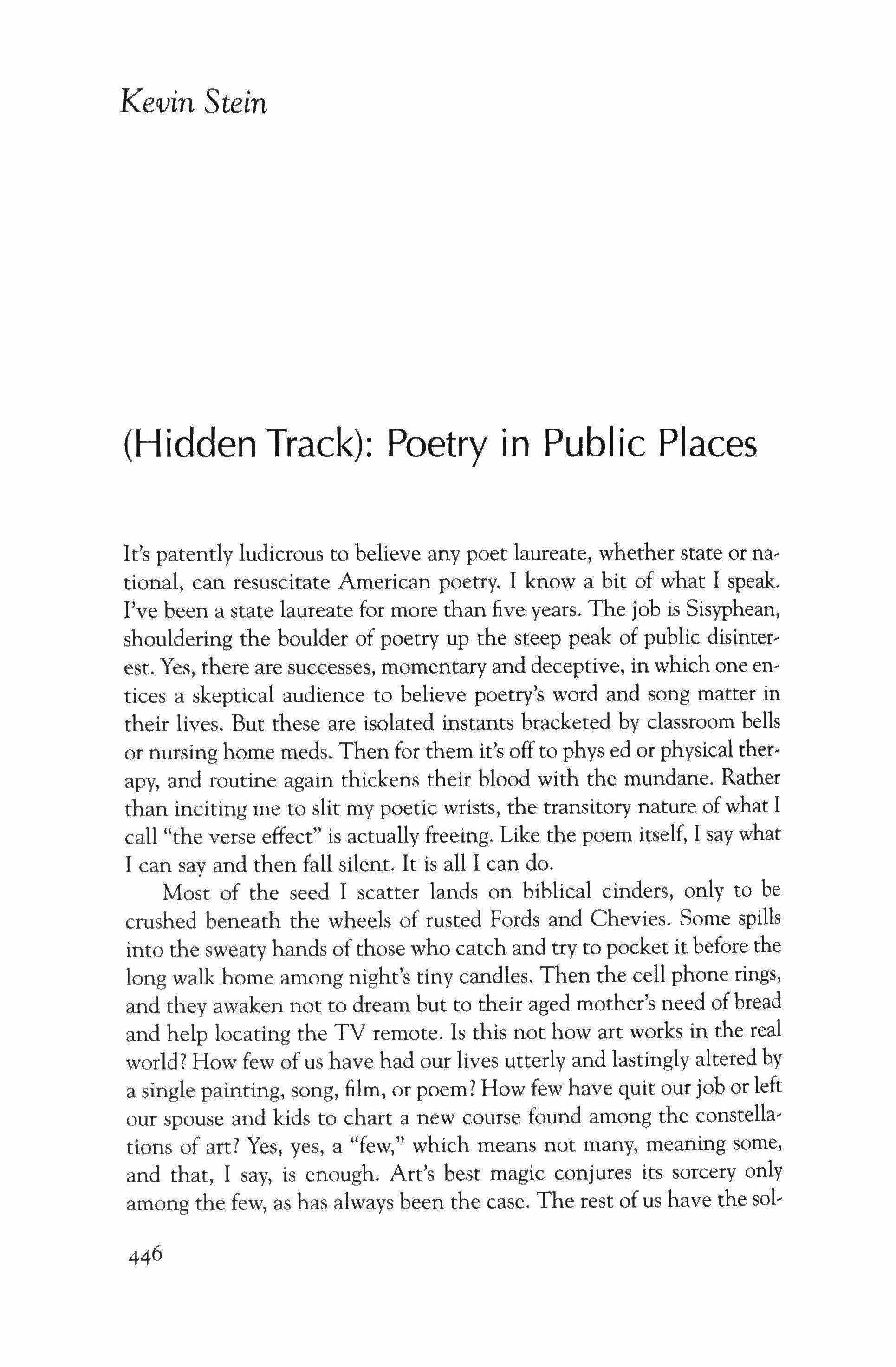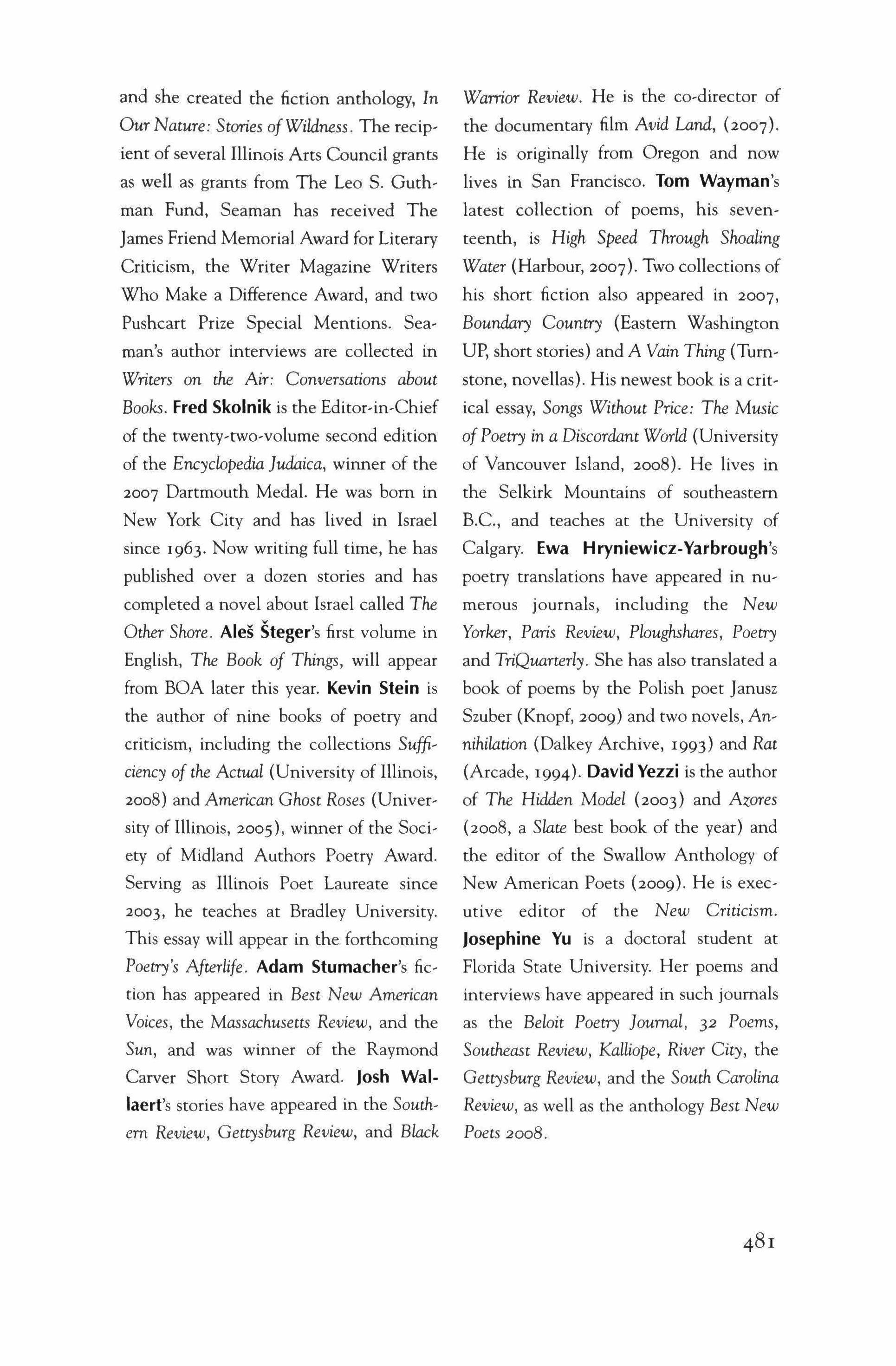 and she created the fiction anthology, In Our Nature: Stories of Wildness. The recipient of several Illinois Arts Council grants as well as grants from The Leo S. Guthman Fund, Seaman has received The James Friend Memorial Award for Literary Criticism, the Writer Magazine Writers Who Make a Difference Award, and two Pushcart Prize Special Mentions. Seaman's author interviews are collected in Writers on the Air: Conversations about Books. Fred Skolnik is the Editor-in-Chief of the twenty-two-volume second edition of the Encyclopedia Judaica, winner of the 2007 Dartmouth Medal. He was born in New York City and has lived in Israel since 1963. Now writing full time, he has published over a dozen stories and has completed a novel about Israel called The Other Shore. Ales Steger's first volume in English, The Book of Things, will appear from BOA later this year. Kevin Stein is the author of nine books of poetry and criticism, including the collections Sufficiency of the Actual (University of Illinois, 2008) and American Ghost Roses (University of Illinois, 2005), winner of the Society of Midland Authors Poetry Award. Serving as Illinois Poet Laureate since 2003, he teaches at Bradley University. This essay will appear in the forthcoming Poetry's Afterlife. Adam Stumacher's fiction has appeared in Best New American Voices, the Massachusetts Review, and the Sun, and was winner of the Raymond Carver Short Story Award. Josh Wallaert's stories have appeared in the Southern Review, Gettysburg Review, and Black