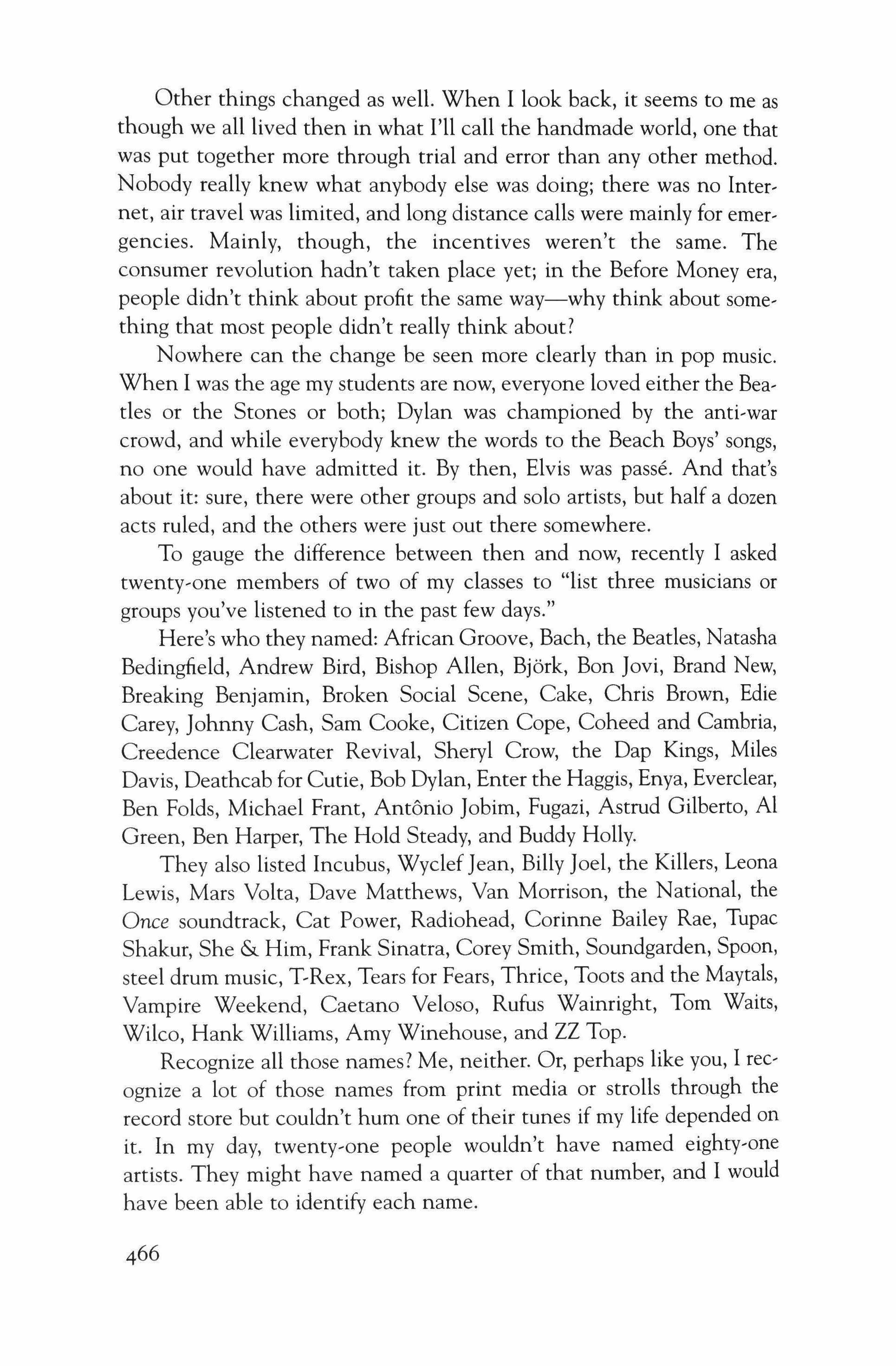 And yet the handmade world will always be with us, as will be the Old, Weird America, though like that invisible republic, it may be hard to see. Look again at my students' list, though: as they search out often arcane tunes, download them to their iPods, and pass their recommendations on via word of mouth, are not they, too, putting together their world by hand? The technology is better; the impulse and the act are the same, are still eclectic and experimental.