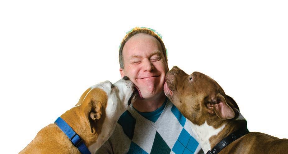 Do not try this at home. Pit Bulls Candy and Bowser demonstrate their softer side with publisher, Troy McQuillen.