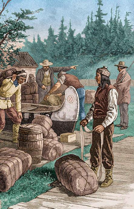 Indians trade furs with settlers at a Hudson's Bay Company trading post.