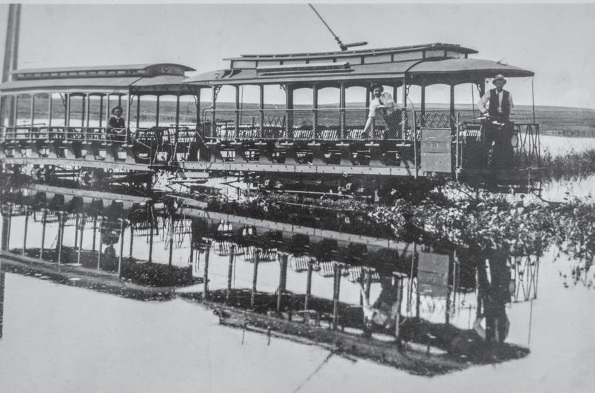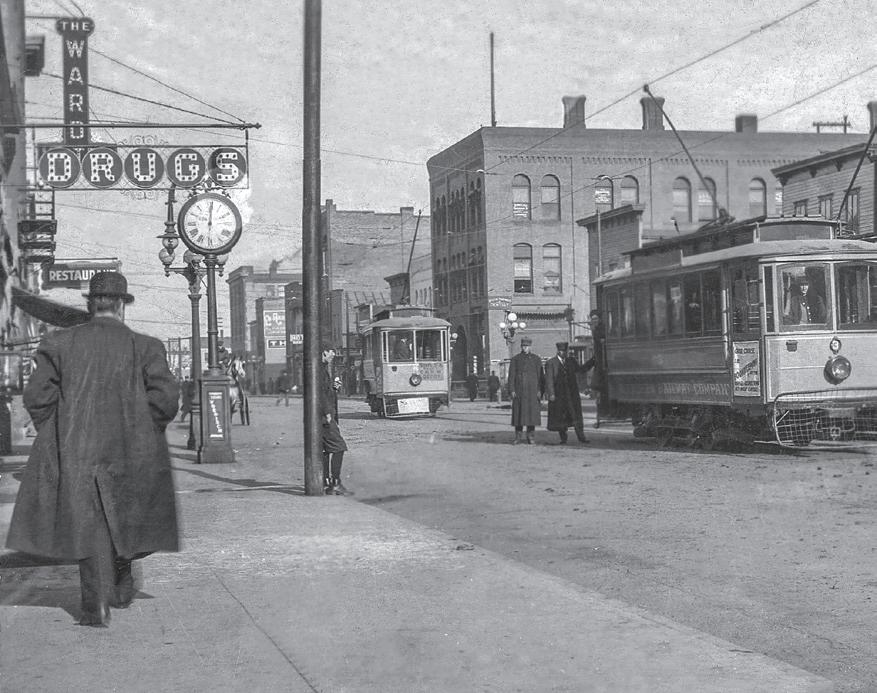 Six reversible street cars arrived in Aberdeen in October 1910. The cars could be driven from either end so that they didn’t need to be turned around at the end of the lines. The company maintained enclosed cars for winter (with pot-belly stoves for heat) and open cars for summer. The first streetcar hit the tracks on Thanksgiving Day 1910. As you can see in the pictures, these were electricpowered trolleys. A web of overhead wires was hung on buildings and poles all throughout town, and to this day you can still see wire brackets on some of the older buildings.