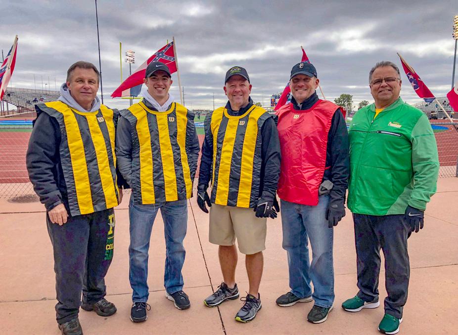 CHS and RHS have longstanding chain gangs too. In the mid-1980s, Ron Lyren’s neighbor was on Central’s chain gang. “They needed a sub one night, and he knew I’d do it,” Ron says. “I’ve been doing it pretty much ever since.” It took Brian Schumacher years to get the Roncalli gig. “It was always on the list of volunteer options for the Booster Club, and I always signed up, but there was never an opening,” he says. Then in 1999, Mark Gjernes was assembling a new chain gang, and he called Brian. About ten years later, Presentation asked Mark to do the same job for their new football program, so he called Brian again. There’s a lot of crossover with the Roncalli chain gang—maybe it’s a green and gold thing or a Catholic thing. Ron says. “I’ve always been around the game. I enjoy being on the line of scrimmage.” He’s also appreciated watching friends of his two daughters who graduated from Central play. For Keith, another perk is “seeing local high school players playing for colleges, seeing them mature. We also saw some future pros, like Vikings Adam Thielen, who played for Mankato, and C.J. Ham, from Augustana.”