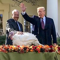 Ruben and a friend drove the turkeys to the White House in an SUV following a send-off celebration in Huron. Jeff flew to the occasion with his family, including his wife, children, grandchildren, and 88-yearold father. Upon their arrival in Washington, Peas and Carrots enjoyed a bit of pampering during their stay at the Willard Hotel, where the average room costs about $500 per night. Ruben and Jeff guided the birds through multiple press conferences and media events before both were pardoned by President Donald Trump at a nationally televised ceremony at the White House Rose Garden. Jeff says, “It was a blast. There’s always concern about the turkeys doing something like flying off or running away, but they did really well.” After their pardoning, both Peas and Carrots moved to Gobblers Rest in Virginia, a home where the two celebrities can comfortably live out the rest of their days.