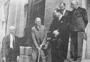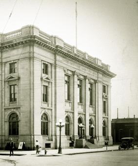 for a new federal building. The postal demands continued to grow and challenge the current building. Some other reasons cited for a new building included increased parking (there were more cars by now) and the need for a large loading dock with better street access. One key reason, however, was the opportunity provided by resources from the WPA and other re-employment programs. Even though the current post office worked, the city didn’t want to lose out on funds that could end up going to a different community. $400,000 was appropriated by Congress, and a new post office courthouse building was completed and opened for business in 1937 on Fourth Avenue. At the same time, Senator Kyle’s building on Main Street was shut down. It stayed locked up and vacant for many years. Then in 1944, Mayor O.M. Tiffany is seen swinging a pickaxe signifying the initial blow of the building’s demolition.