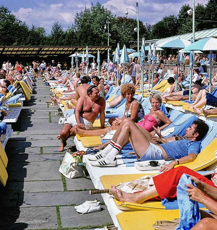 Vacationers resting poolside at Grossinger’s Catskill Resort Hotel, Liberty, New York; photo by John Margolies, c. 1977. This iconic image of poolside leisure embodies the golden era of the Borscht Belt—an essential chapter of American Jewish life and culture. Families gather, sunbathe, and schmooze in a scene that recalls the heyday of the Catskills resorts, where community, comedy, and comfort reigned supreme.