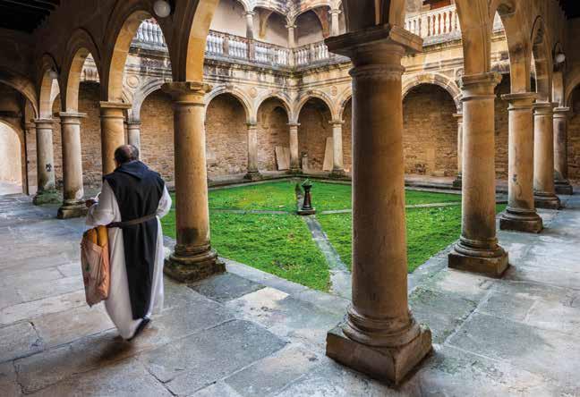After two kilometres, we reach the Monastery and enter the front portico on foot through one of its accesses next to the crosses, passing through its interior portico. It is highly recommended to take a few minutes to enjoy a building as special as this one. We will leave the car park and take the well-kept path that marks the Way of St James, likely sharing sections of it with pilgrims.