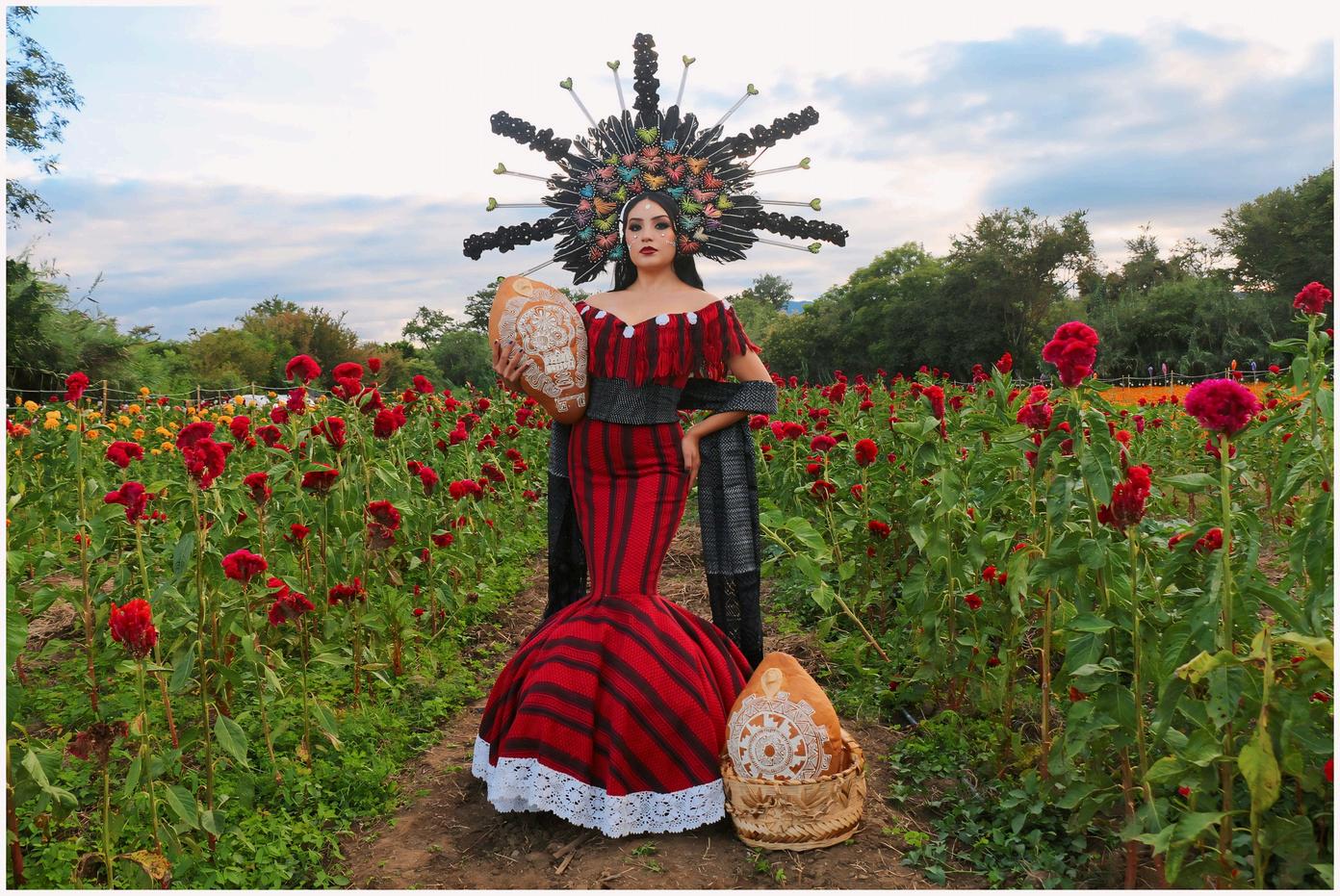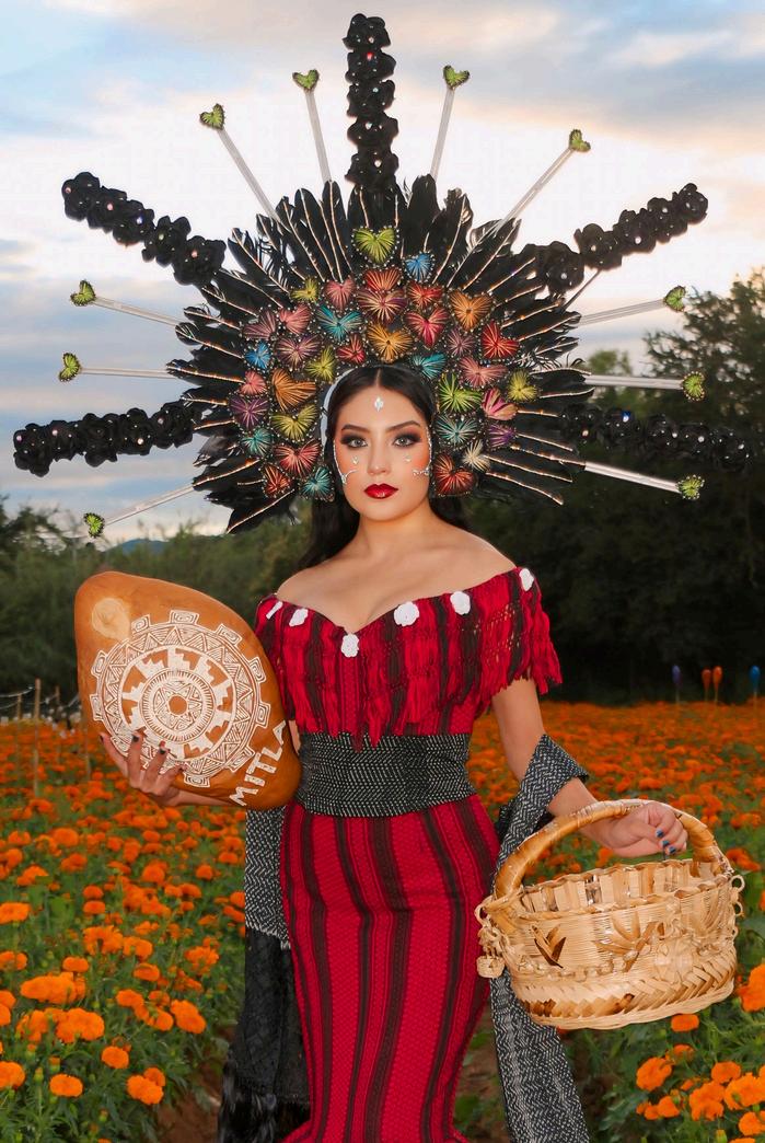 Vestido confeccionado en manta de telar en cuyo nombre es ladbeguj y se compone de ladj que significa tela y begu que significa grana cochinilla, en el tejido se plasman símbolos que representan el maíz, el frijol y el cacao inspirado en el traje tradicional de san Pablo villa de mitla ciudad sagrada de los muertos donde según la mitología es la entrada a el mictlan. complementa el atuendo un reboso de seda como accesorio canasto de carrizo tejido a mano y como complemento panes tradicionales típicos y únicos de la población