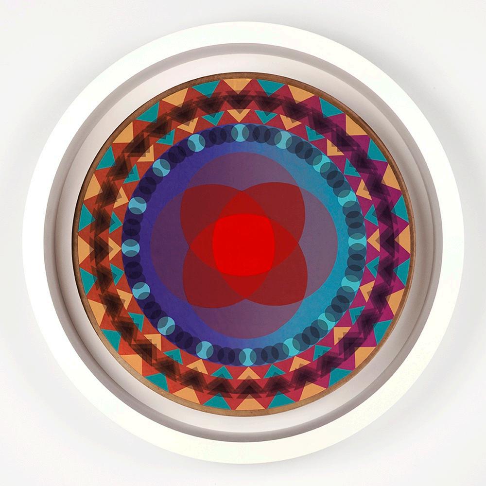 Jeffrey Gibson Round Dancing, 2021 unique elk hide handmade drum with screenprint 25.75 x 25.75 x 4.5" framed $31000 framed