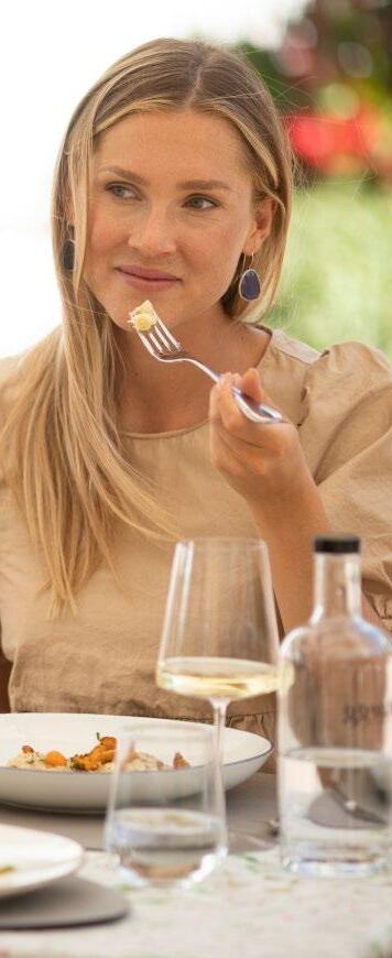 Die Hausherrin selbst sieht sich vor allem als Ansprechpartnerin und Bindeglied zwischen Gast, Küche, Weinkeller, Produzenten, Lieferanten, Partnern.
