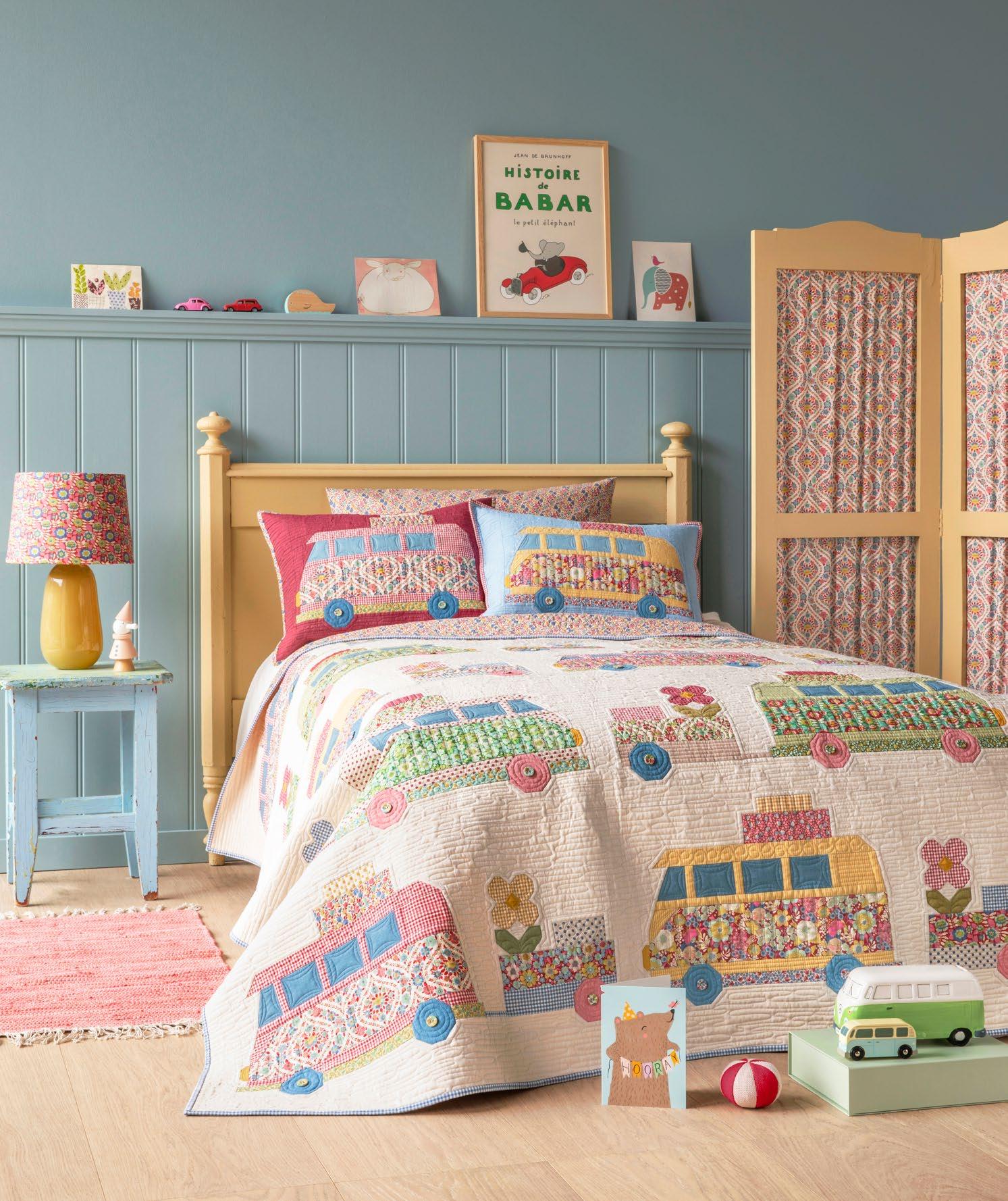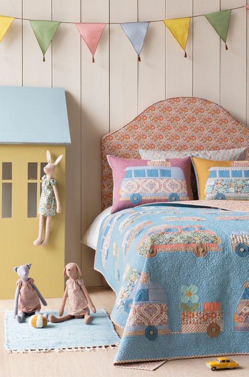 Pictures show Campervan quilt Petrol and pillows, Wallflower quilt Prussion with pillows and sweet Creating Memories gift bags in spring colors.