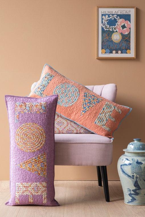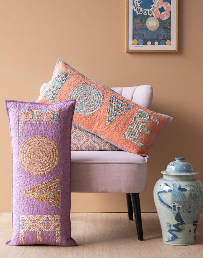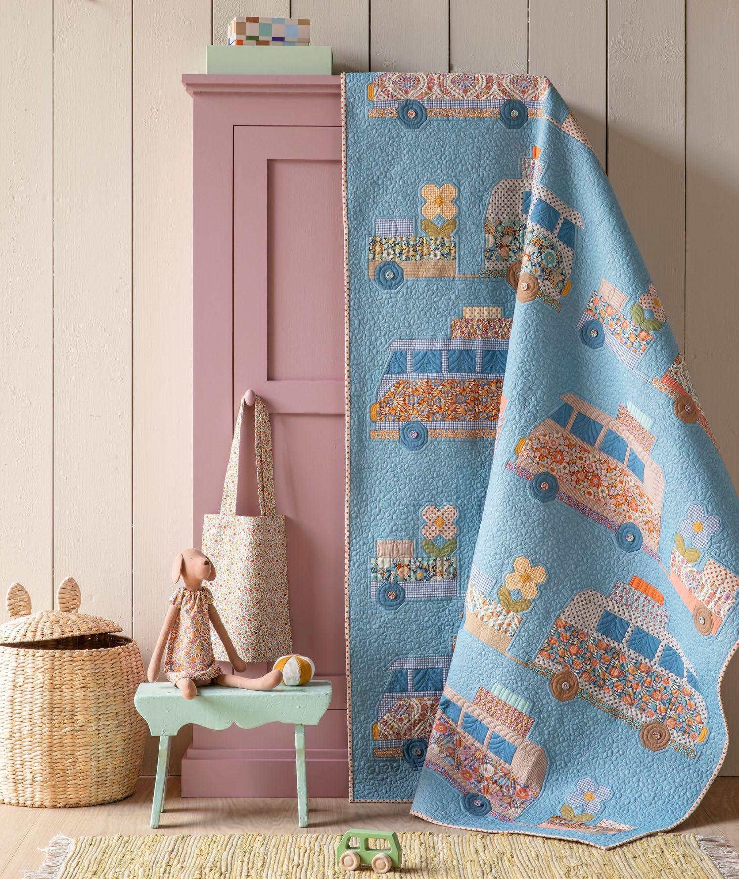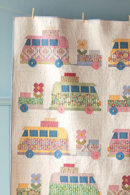Given the state of the world at the time this collection was designed and the inspiration behind the fabrics, it seemed fitting to promote some good thoughts through the naive but heartfelt Peace and Love quilts. The era also inspired the cute Campervan quilt designs where buttons are used as decoration on the wheels, and, of course, a whimsical flower quilt is a must.