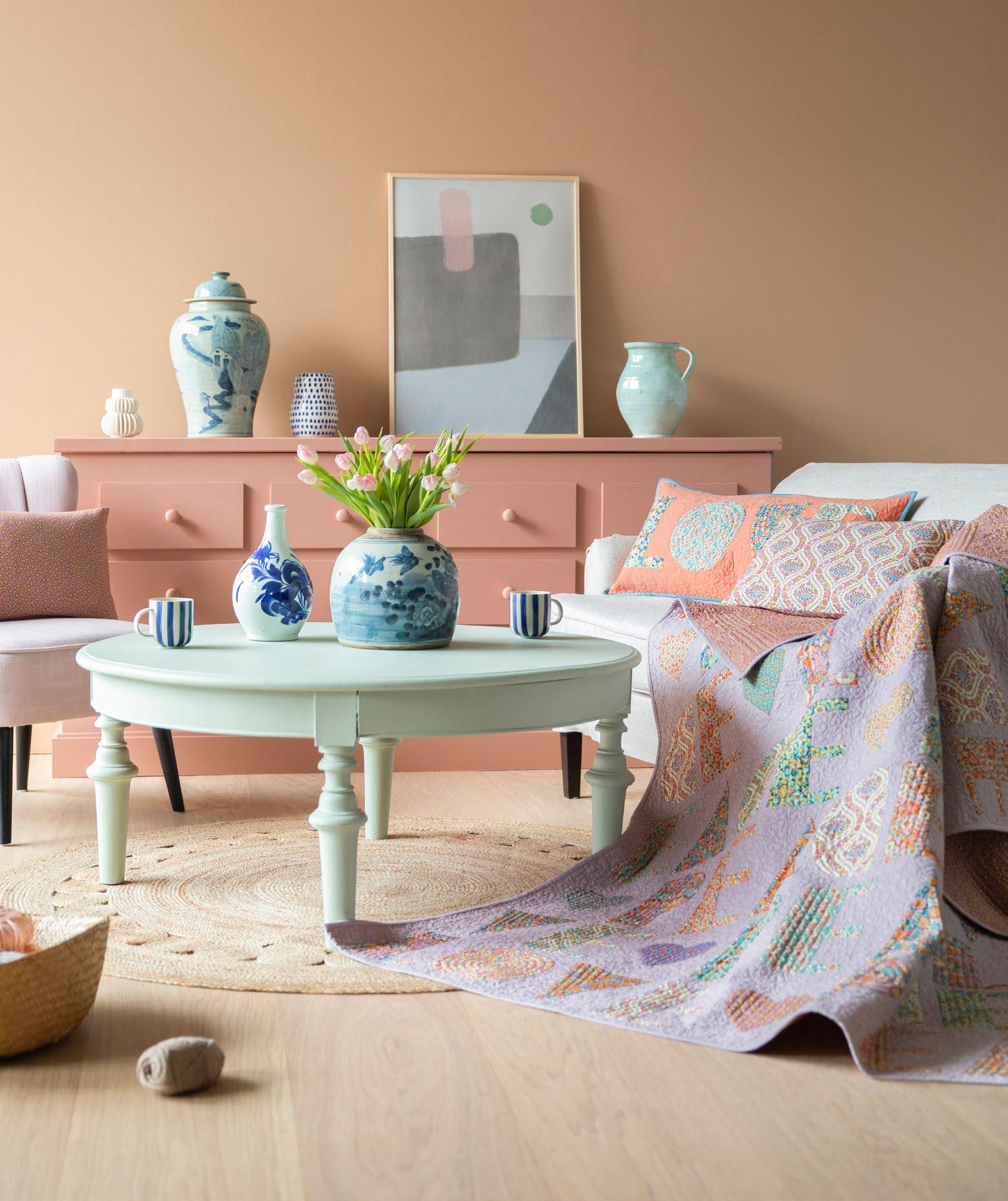 The collection has two distinctive color stories. One is sweet and fresh with vintage reds, greens and pinks with hints of blue and sour yellow. The other is more of a nod to the 1960s and 70s, with caramel, blue, ginger, ochre and thistle tones. All the quilt designs are presented in the two different colorways with matching pillows and will be released with the collection as free patterns on tildasworld.com.