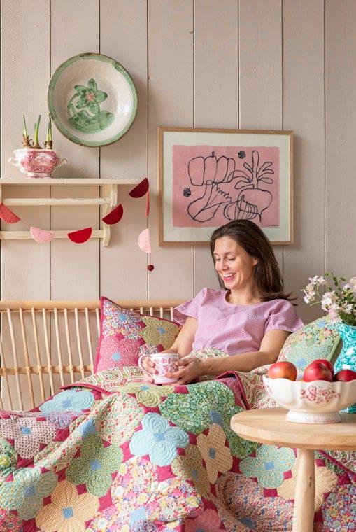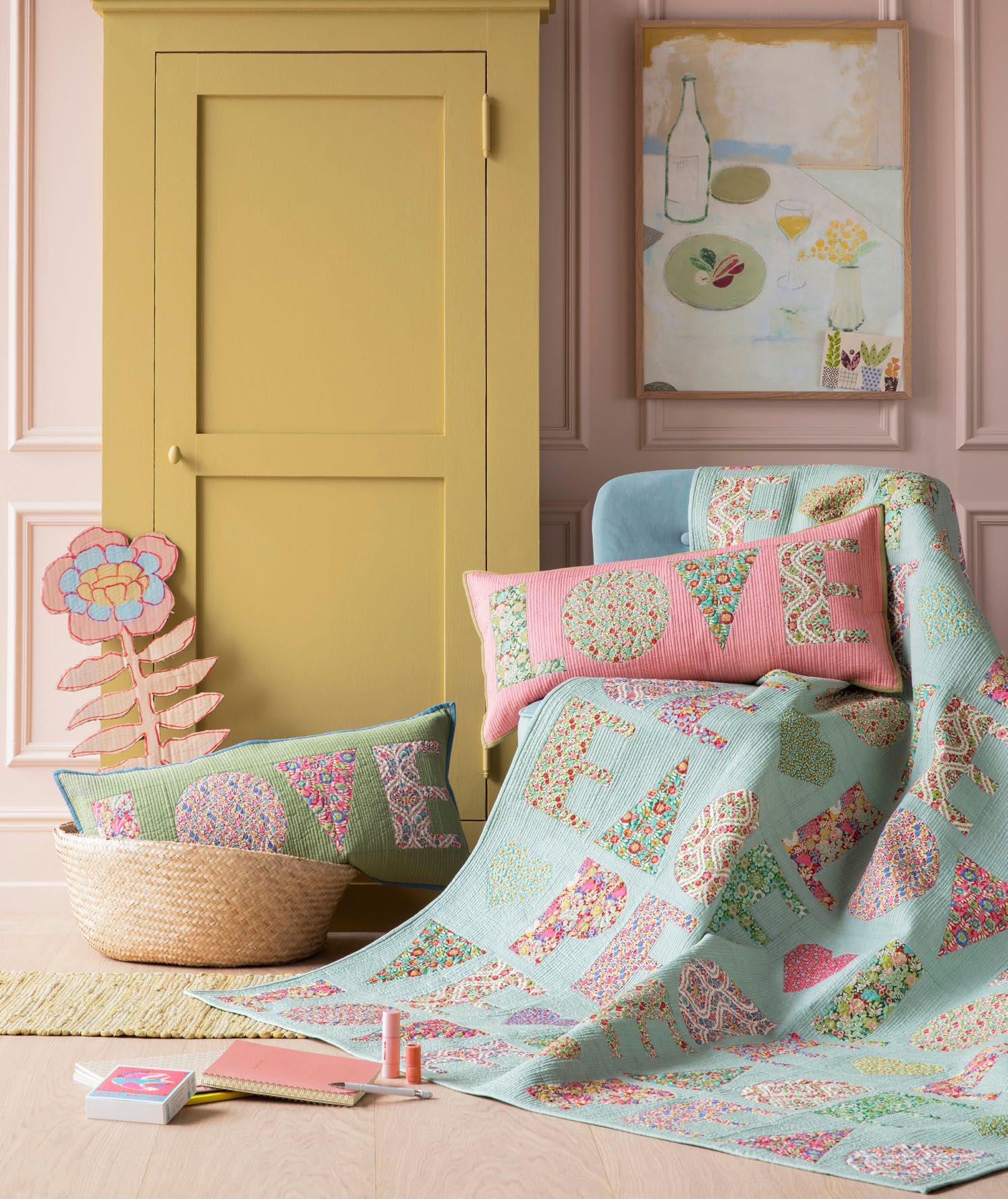 This selection of projects is sewn in Burgundy Pink and Green Wallflower fabrics. This page, the sweet Wallflower Quilt Burgundy with pillows. Right – Peace & Love quilt Red/Green with pillows and Campervan quilt Putty White. All free patterns on tildasworld.com