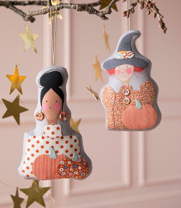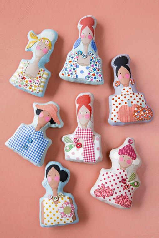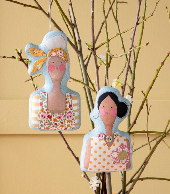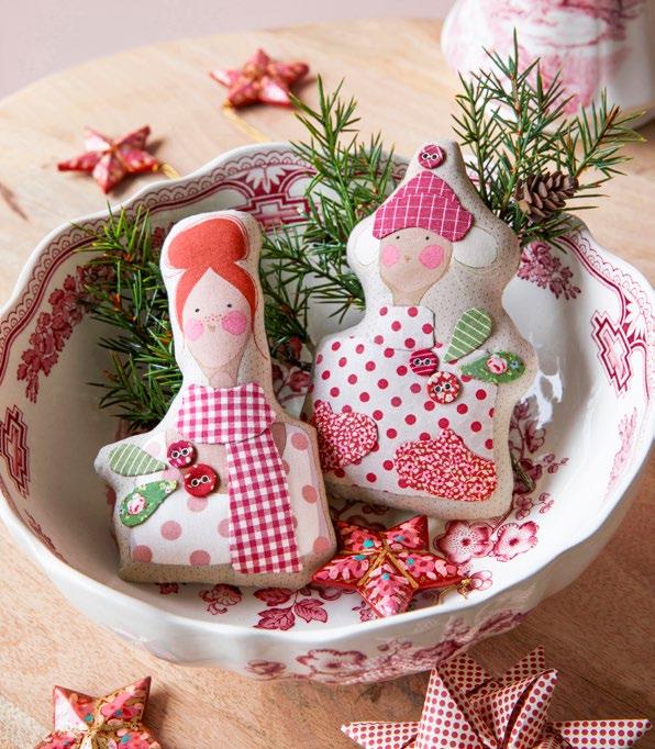 Personalize the friends with appliqué clothes, buttons and embroidery. Patterns for appliqué clothes can be found on tildasworld.com. The pictures show fun seasonal ornaments, where we have matched Me and My Friend with Creating Memories fabrics and buttons.