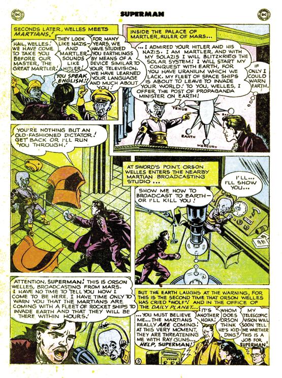 actor Orson Welles. In the tale, fresh from filming his 1949 movie Black Magic, and still in costume, Welles accidentally got trapped aboard a rocket destined for Mars, where he discovered the red planet had a Hitler-like monarch about to attack Earth. Welles broadcast to Earth about the impending doom but he wasn’t believed because of his The War of the Worlds radio broadcast in 1939 (which really did fool a lot of people into believing that Mars had invaded Earth). Only Superman, using his telescopic vision, could see that Welles was telling the truth. Together, the superhero and the movie star defeated the Martian tyrant. Wayne Boring drew a fun tale, even though he didn’t capture Welles’ looks.