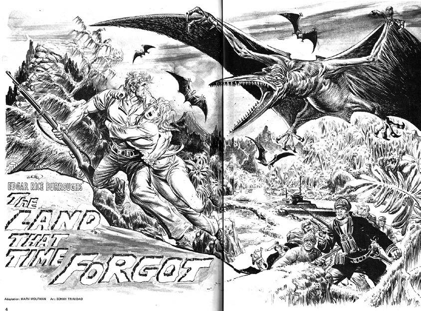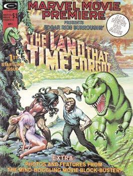 (above and left) Painted cover by Nick Cardy for the adaptation of Edgar Rice Burroughs’ The Land That Time Forgot (1975). Marvel Movie Premiere #1 (Sept. 1975). Marv Wolfman’s script, complemented by Sonny Trinidad’s action-packed art, was better than the film it was based on.