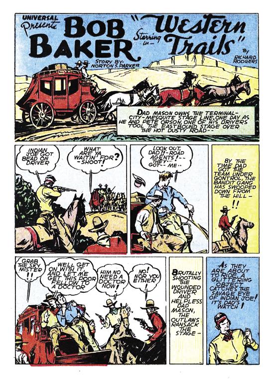 (left) Splash page for Western Trails (1938) in The Funnies #26 (Dell, Nov. 1938).