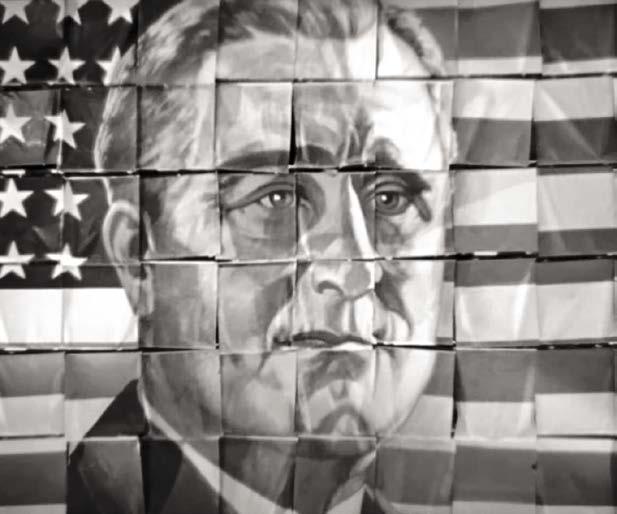 In 1932, Franklin Delano Roosevelt won an overwhelming majority of votes over Hoover and in 1933 began what would turn out to be an unprecented 12 years as President. Belief in him rescuing the country from despair was demonstrated in Warner Bros.’ Footlight Parade (1933) during a Busby Berkeley musical number in which his image filled the screen using multiple sections held together by dancers and extras underneath.