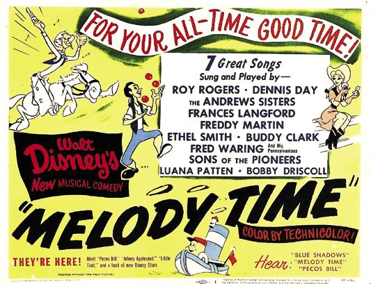 MELODY TIME : Melody Time (1948) was another multisegment animated/live-action movie from Walt Disney. There were a total of eight sections, with each set to music. Standouts were cartoons featuring legendary Pecos Bill (sung offscreen by Roy Rogers), Johnny Appleseed (Dennis Day) and Little Toot (the Andrews Sisters), the latter about a small tugboat trying to help his father, a New York harbor tugboat, but resulting in a series of comical errors.