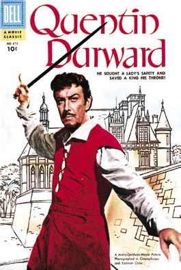 (top left and bottom) In Quentin Durward (1955), Robert Taylor was still a dashing hero, and Kay Kelland was never lovelier. Ralph Mayo’s art was excellently done throughout the Dell adaptation (Four Color #672).
