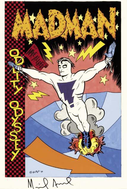 (top left) Severed heads and spooky ghouls in Mike Allred’s original art to Tundra’s Madman #2. (top right) Allred’s original art for an unused Wizard magazine cover. (bottom left) Original color art created on acetate for Kitchen Sink’s Madman: The Oddity Odyssey trade paperback. (bottom right) This original art was created for the inside front cover of Dark Horse’s Madman Comics #2. (opposite page, top left) Mike Allred’s original art for Madman Comics: Yearbook ’95 trade paperback from Dark Horse Comics. (opposite page, top right) The Atomics #14 original art for Allred’s own AAA Pop Comics. (opposite page, bottom) Madman: Two Trilogies original art for Graphitti Designs. Original art scans courtesy of Heritage Auctions (www.ha.com).