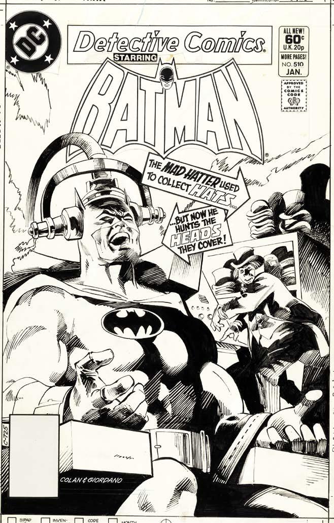 (top left) The original art for Gene Colan and Dick Giordano’s electrifying cover to Batman #510. Original art scan courtesy of Heritage Auctions (www.ha.com). The Hatter seeks some serious information in Detective Comics #526. (inset) You can’t keep a Mad Hatter down.