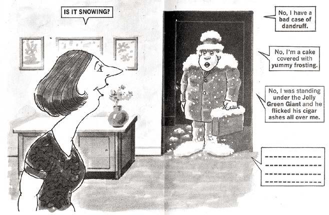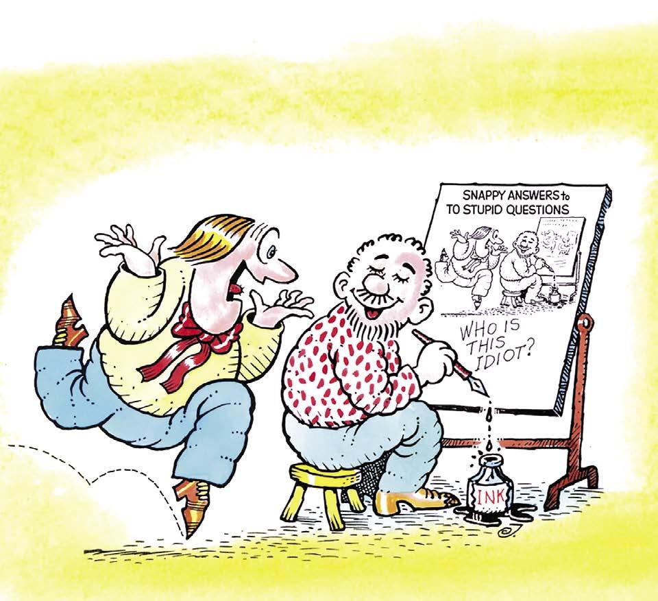 MAD. He also produced “Snappy Answers to Stupid Questions,” which were exactly what they sound like. “Snappy Answers” depicted obvious and easily understood situations about which someone asks an ignorant question, to which three sarcastic replies are provided. For example, a man walks through the front door of his home, covered from head to toe in flakes of white like Frosty himself and his wife asks, “Is it snowing?” to which the man replies, “No, I have a bad case of dandruff.”