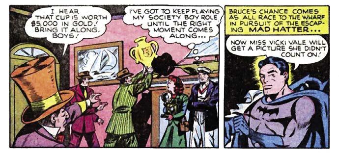 Plotwise, the Hatter once more abandons his predilection for stealing headwear and instead commits crimes based on phrases that involve hats, including a ‘hat trick’ in hockey and a politician ‘throwing his hat into the ring.’ He is, of course, once again….handed his hat by Batman.