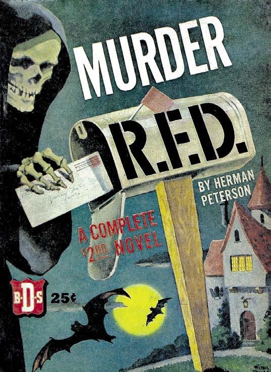 Corpses, was the first to make use of this skull imagery, and it is most likely Higgins’ art. Author Edward Aarons, who went by the pseudonym Edward Ronns, later wrote a popular 42-novel series about Sam Durrell, CIA agent. Goodman soon dropped the title banners, giving more room to the cover image. The Herman Peterson scripted Murder RFD is the first Peter Driben cover, and it’s a honey. Another sensational Driben cover graces The Traveling Corpses. Author Kurt Steel penned three other novels in the Atlas digest series.