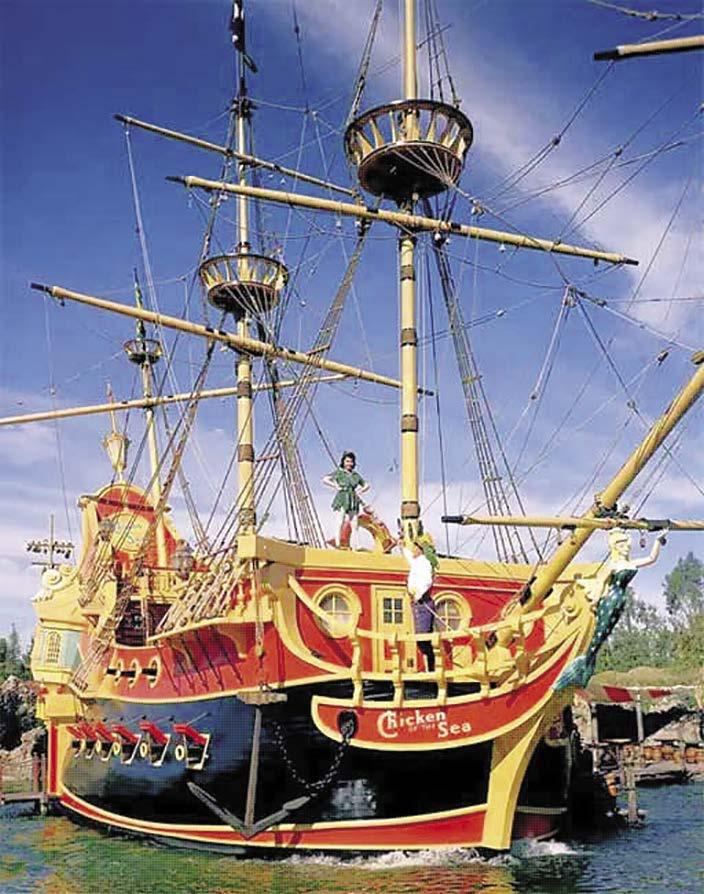 After a tower crane dropped it into place between the Mad Tea Party and Dumbo the Flying Elephant rides at Walt Disney’s Fantasyland in Anaheim, California, the Chicken of the Sea Pirate Ship and Restaurant was “launched” on August 29, 1955. Inspired by the 1953 Walt Disney animated film Peter Pan, the scaled-down galleon was anchored in a small pond (with the addition of a large skull waterfall in 1960), where visitors would board the ship and wander until they worked up an appetite for lunch, conveniently provided by the restaurant just a few steps away. Sponsored by the