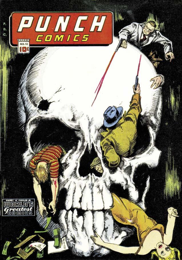 The hideous glare of the human skull, of course, went hand-in-hand with the more diabolical side of horror, but it also made its ill-boding presence felt on many a crime pulp. Soon after the advent of the comic book in the latter part of the 1930s, it wasn’t long before this leering visage had become a menacing prospect on the covers of certain Golden Age superhero titles. As early as the cover to