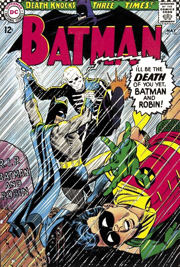 One such character is Death-Man, a skull-andcrossbones-wearing gang boss, who made his eerie debut in Batman #180, cover-dated May 1966. For a mere twelve cents, fans could enjoy the full-length novel “Death Knocks Three Times,” a 24-page, threechapter tale distinguishable from many of the day’s campy, G-rated Batman stories.
