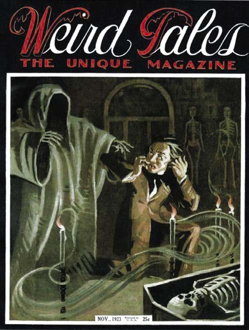 long since been forgotten—a great shame, for he conveyed the threat confronting this extremely inquisitive fellow in an accordingly chilling manner, who to his horror had stumbled upon an eerie crypt concealing several wellpreserved skeletons. Of course, such unspoiled skeletons were there to exacerbate the tension, as they would on countless covers of this unsettling ilk. This issue of Weird Tales, numbered Vol. 2 #4, is of particular note, as it included “The Invisible Monster,” later known as “The Horror at Martin’s Beach,” a tale co-written by HP Lovecraft and his wife-to-be Sonia Haft Green [above]