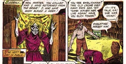 conquest. Daro is not a witch doctor, but a crooked businessman, and yet just the mention of Haiti in this tale, the traditional home for zombies and the voodoo religion, was enough to establish a certain historic precedent. The following year, George Tuska depicted zombies staggering through the Louisiana bayous in a Zanzibar the Magician strip for Mystery Men Comics #12 (July 1940); and Allen Spectre (?) signed off on “The Voodoo Man” of Haiti for Weird Comics #1 (April 1940). Then Ted BrodieMack opposed Tabu, Wizard of the Jungle, against Celie, Queen of the Zombies, in Jungle Comics #2 (Dec. 1941). Zombies from Haiti and other tropical isles, as well as darkest Africa and the swamps of creole America, continued to regain consciousness throughout the 1940s. However, voodoo zombies were not the only