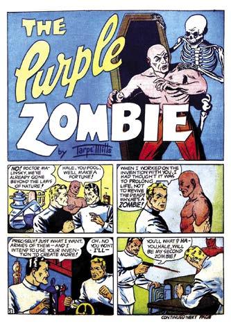 The Crimson Avenger in Detective Comics #23 (Jan. 1939) captures a guy in a white lab coat, who has fabricated a gang of zombies through scientific experimentation in his laboratory. Another early superhero, Shock Gibson, encounters furry, green, oneeyed zombies that seem more cuddly than frightening, while attempting to stop a demented inventor in Speed Comics #1 (Oct. 1939). Two more early examples of super-science zombies include Zoro the Purple Zombie drawn by Tarpé Mills for Reg’lar Fellers Heroic Comics #4 (Aug. 1940) and the walking undead in a memorable Captain America story “The Case of the Hollow Men” by Joe Simon and Jack Kirby for All-Winners Comics #1 (Summer 1941), which could be regarded as the precursor to the onscreen carnage that ensued several decades later.
