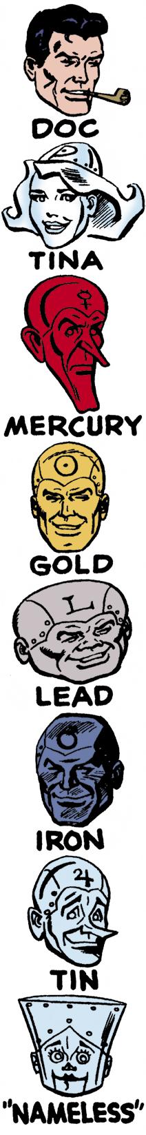 Whipped up to satisfy a crunch deadline, the Metal Men were created by writer-editor Robert “Bob” Kanigher, penciller Ross Andru, and inker Mike Esposito. The robots’ powers and dispositions were based on properties of the metals they were made from. Comprising the original lineup were Gold, the pure-hearted leader; Mercury, the group’s hothead; Iron, the group’s muscle; Lead, the group’s shield; Tin, the bashful striver; and Platinum (nicknamed “Tina”), who was madly in love with “Doc” Will Magnus, the Metal Men’s pipe-smoking inventor.