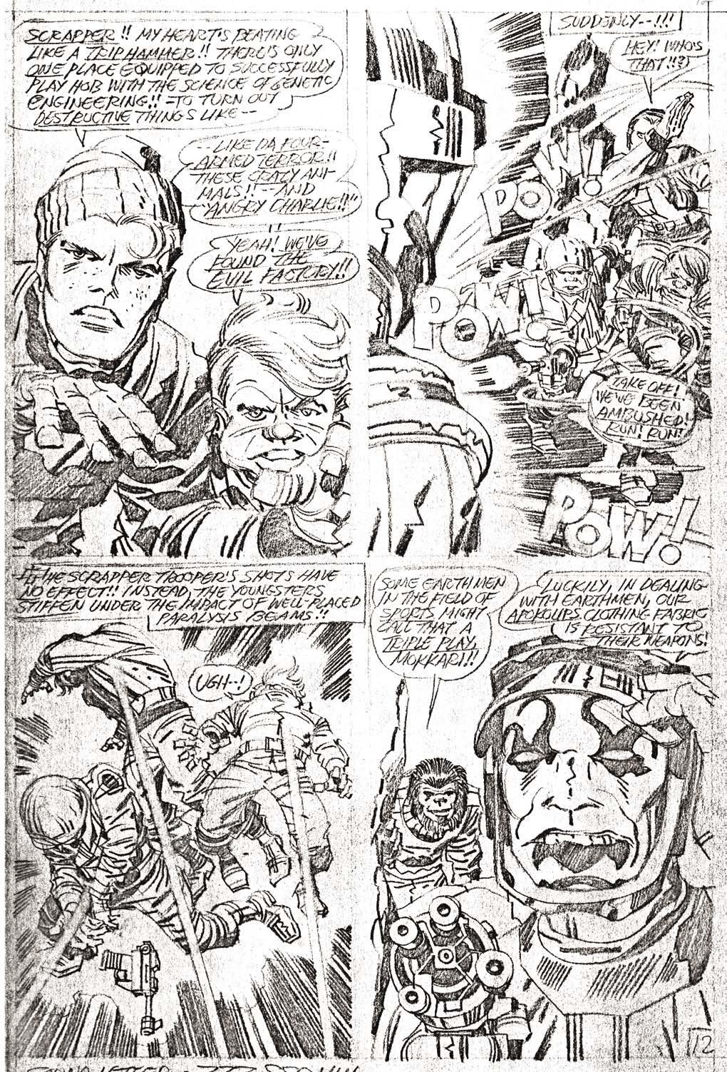 Speaking of Morgan Edge (you have read the previous piece, have you not?), what better way to open a Kirby pencil gallery than with a page of his final depiction of Edge. And what a sinister, evocative image it is in panel 4—one of Kirby’s best of him, surely—and, as we can see if we compare this to the published version, far better in pencil than in ink. (I’m not one who hates all Vince Colletta’s inking—there were some very good jobs—but this book isn’t one of the best. The inking on panel 4 here loses much of what Kirby achieved in pencil form, while there are details omitted in panels 2 and 6, Edge’s hair is often simply blacked in over the detail, and the background in panel 2 has lost all life.)