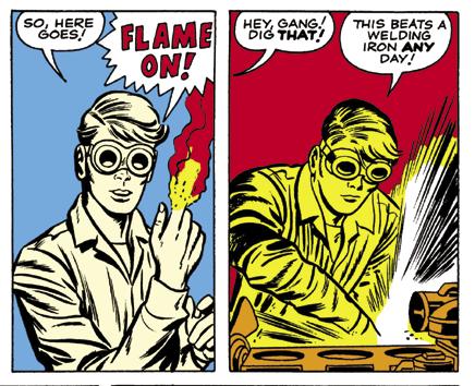 t can be argued that from a socio-economic perspective, the modern teenager was invented in the post-war era of the mid-1950s. James Dean was certainly the celluloid teenage role model, as Elvis was a musical Dean wannabe who made rock ’n’ roll the official teenage music. Comics followed suit with the teenage Legion of Super-Heroes in 1958 and the Justice League’s pseudo hipster teen mascot Snapper Carr in 1960. But it wasn’t until 1961 that Kirby and Lee’s Fantastic Four presented us with the most well rounded and actually cool teen comic book character in the form of Johnny Storm, a.k.a. the Human Torch. Johnny was temperamentally perfect to represent his generation. Dean would have been a perfect casting choice for the Torch, or perhaps Steve McQueen if we had caught him at 17 instead of seeing him pretend to be that age in The Blob.