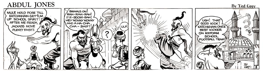 [this page] Here are two of Jack Kirby’s earliest professional jobs. The Black Buccaneer hails from 1937, when Jack was a mere 20 years old. Amazingly, this original art is still in existence. Jack’s mother Rose saved clippings from newspapers her son’s work appeared in, and many of those are the source material for images in this issue. Below is a previously unpublished Abdul Jones strip, drawn at the tail end of 1937, for release to papers in early 1938.