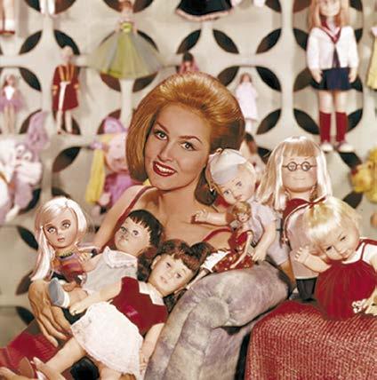 (FAR LEFT) Who needs an instruction manual? Bob Cummings and Julie Newmar get things started. (LEFT) Newmar as AF-709 stops traffic in the first episode of My Living Doll while wearing only a towel-like outfit. (BELOW) Newmar smiles with actual dolls in this promotional photo. © CBS Studios. © Jack and Florence Chertok.