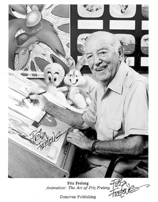 (LEFT) David DePatie. (CENTER) Friz Freleng in a signed promotional photo for Animation: The Art of Friz Freleng. Courtesy of Donovan Publishing. (RIGHT) Logo of the DePatie-Freleng Films Marvel period.