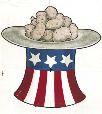 Mr. Potato Head box front minus digitally removed text. Courtesy of the Secret Sanctum Archives. © Hasbro. (ABOVE RIGHT) Due to rationing, citizens were encouraged to not waste food during World War II. Courtesy of the University of North Texas Digital Library. (LEFT) Detail of a World War I potato promotion. Courtesy of USDA.