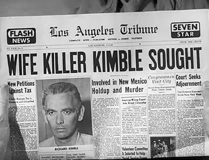(RIGHT) Dr. Richard Kimble on the run... because (LEFT) he was a “wife killer being sought” (more like hounded). © Paramount. Courtesy of IMDb.