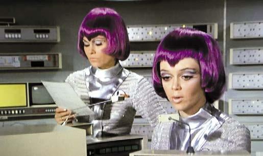 On Earth, in a secret base underneath a working film studio, women played a more-or-less supportive role in SHADO’s operations, watching screens and fetching coffee in their skintight uniforms, but on the moon they were integral to the group’s operations there. Dressed in odd purple wigs and slinky silver suits that could be edited down to swingin’ scanties for off-duty relaxation in co-ed dorms, the moon women appeared to be in charge.