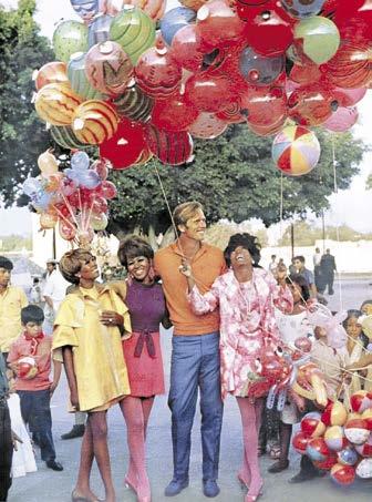Ron Ely (center) strolls down a boulevard with Diana Ross, Cindy Birdsong, and Mary Wilson of the Supremes, balloons in tow, on location to film the Tarzan episode “The Convert.” Banner Productions/NBC. Tarzan TM and © Edgar Rice Burroughs (ERB).