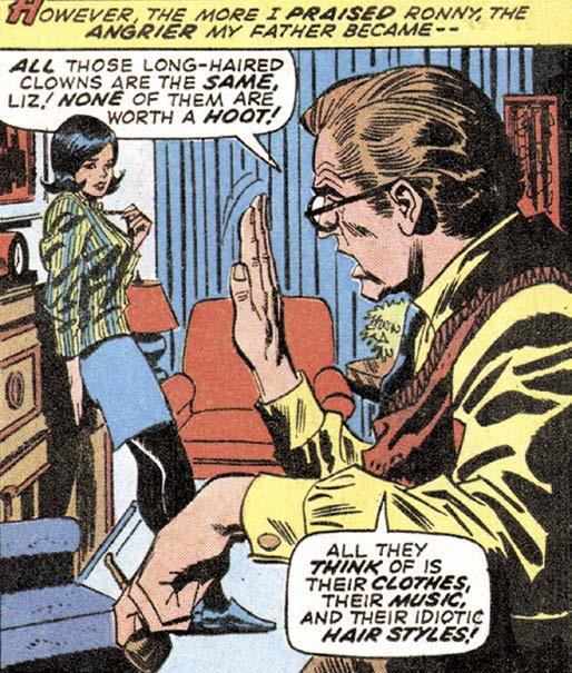 (LEFT) Panel from “His Hair is Long and I Love Him!” in My Love #21 (January 1973) written by Stan Lee with art by Gene Colan and Frank Giacoia. (ABOVE) “Suzan Says” column from My Love #1 (September 1969). © Marvel.