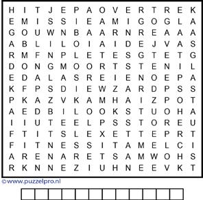 De woorden zitten horizontaal, verticaal en diagonaal in alle richtingen in de puzzel verstopt. Ze kunnen elkaar overlappen. Zoek ze op en streep ze af. De overblijvende letters vormen achter elkaar gelezen de oplossing.