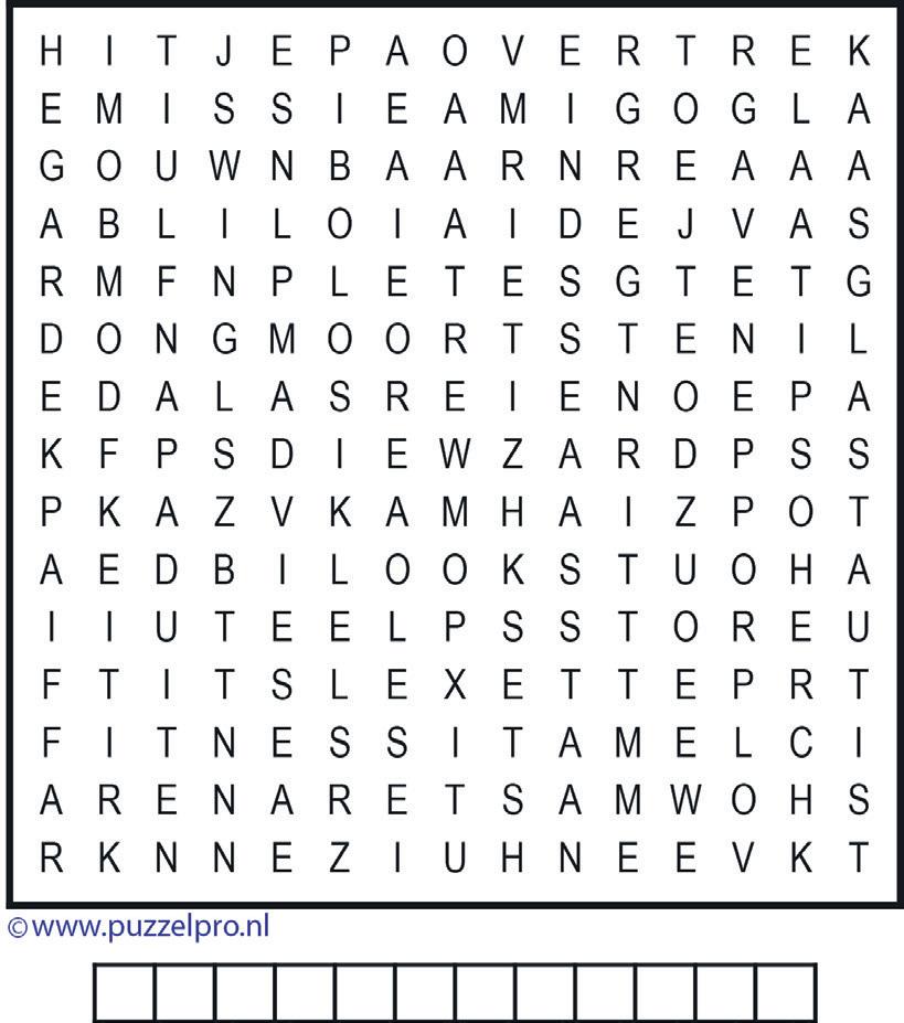 De woorden zitten horizontaal, verticaal en diagonaal in alle richtingen in de puzzel verstopt. Ze kunnen elkaar overlappen. Zoek ze op en streep ze af. De overblijvende letters vormen achter elkaar gelezen de oplossing.
